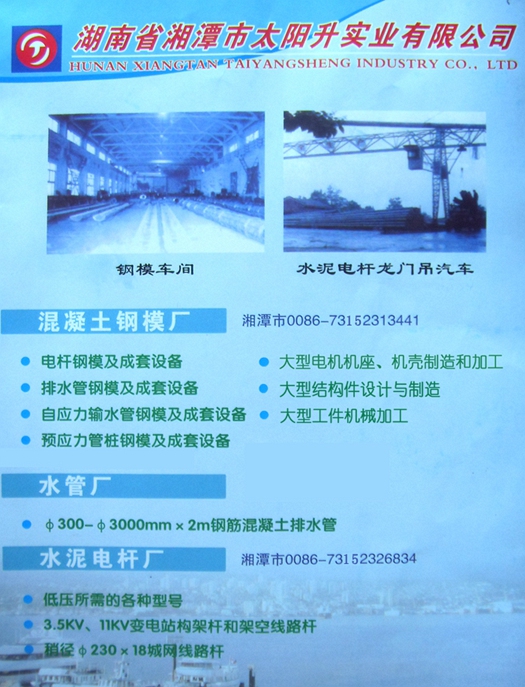 1、鋼模制造廠: ①電桿鋼模及成套設(shè)備和技術(shù)服務(wù); ②給排水管鋼模及成套設(shè)備和技術(shù)服務(wù); ③預(yù)應(yīng)力管樁鋼模及成套設(shè)備和技術(shù)服務(wù); ④預(yù)應(yīng)力高強(qiáng)絲生產(chǎn)成套設(shè)備和技術(shù)服務(wù); ⑤大型結(jié)構(gòu)件設(shè)計(jì)與制造。 2、預(yù)應(yīng)力水泥電桿廠: 高、低壓線(xiàn)路桿和構(gòu)架桿,錐型;等徑 、系列配件。 3、排水管廠: 生產(chǎn)Φ200~Φ400×2m平口、企口、承插、頂管等系列產(chǎn)品,為鐵路、公路、排污、引水、市政、房建等工程配套使用。